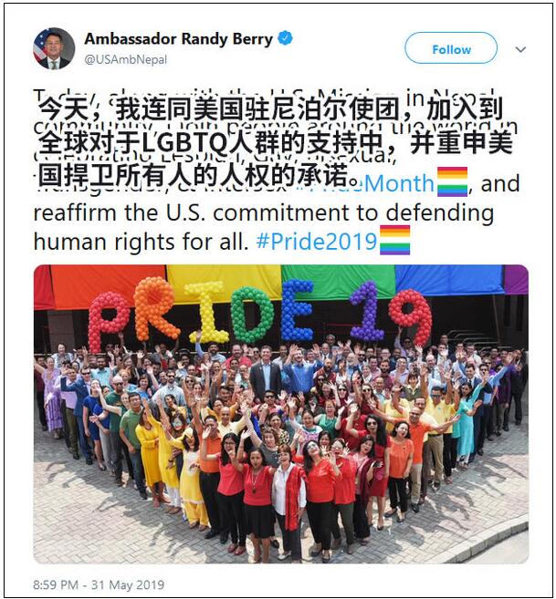 美国驻尼泊尔大使在推特上发了一张照片,照片上他和使馆工作人员举着写有“PRIDE 19”字母的气球。