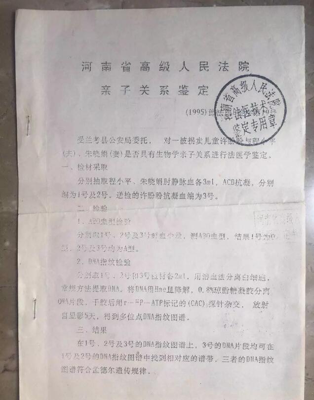 1996年,经河南省高院鉴定,被拐孩子与朱晓娟夫妇具有生物学亲子关系