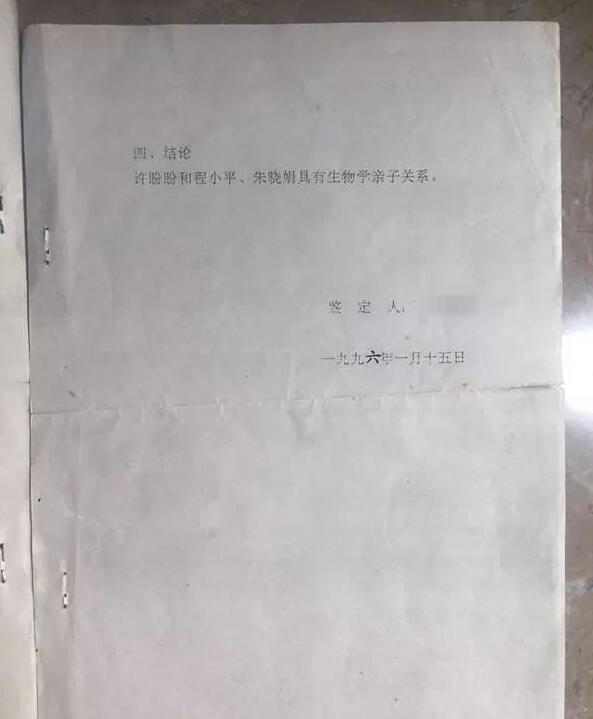 20天后,已是1996年年初,朱晓娟收到了河南省高院寄送的鉴定文书。红星新闻注意到,该文书显示,被拐孩子“许盼盼”与朱晓娟夫妇具有生物学亲子关系。