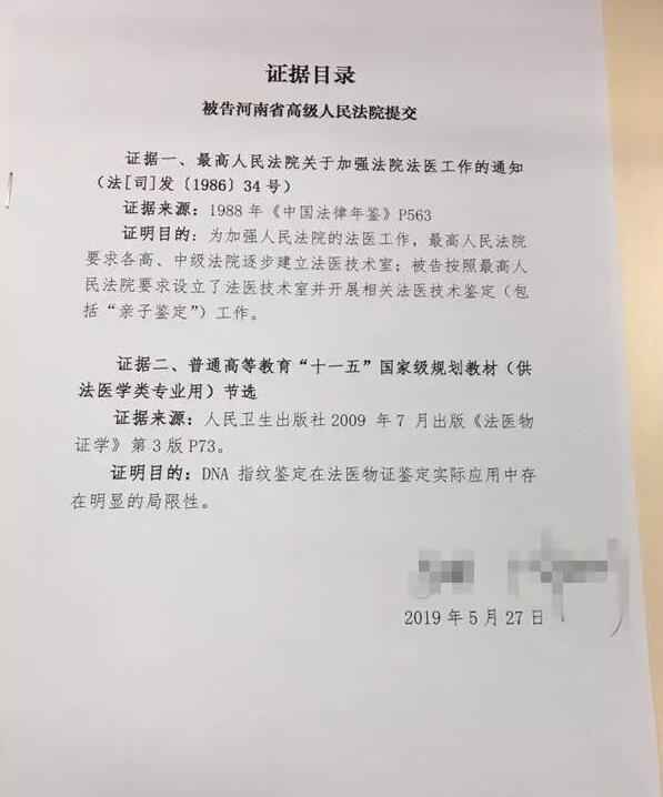 5月27日,在重庆市渝中区人民法院内,原被告双方进行证据交换及庭前调解。河南省高院提交了两份证据:一是1988年《中国法律年鉴》第563页,二是人民卫生出版社2009年7月出版的《法医物证学》(第3版)第73页。