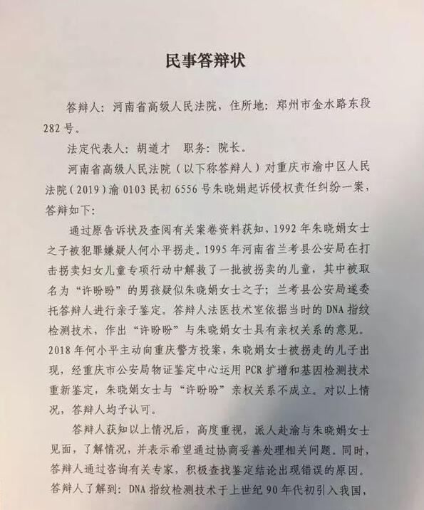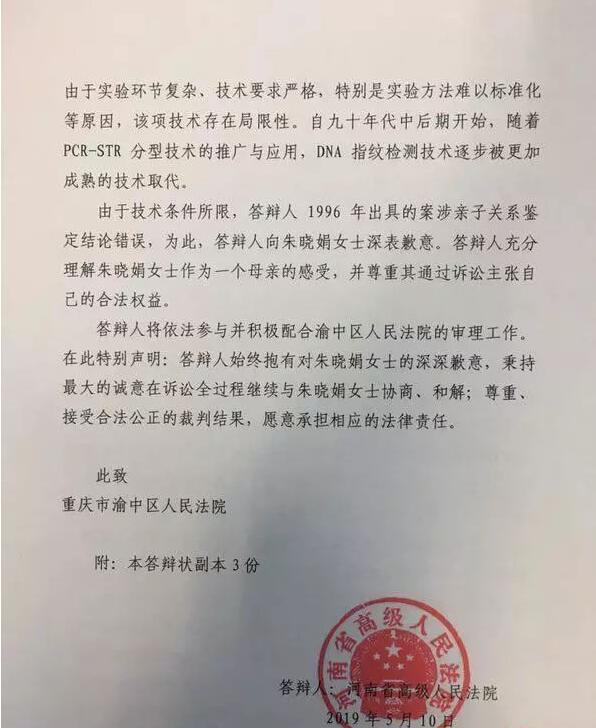 河南省高院答辩称,DNA指纹检测技术于上世纪90年代进入我国,由于实验环节复杂、技术要求严格,特别是实验方法难以标准化等原因,该项技术存在局限性,“由于技术条件所限,答辩人1996年出具的案涉亲子关系鉴定结论错误,为此,向朱晓娟女士深表歉意……答辩人抱有对朱晓娟女士的深深歉意,秉持最大诚意在诉讼全过程继续与朱晓娟女士协商、和解;尊重、接受合法公正的裁决结果,愿意承担相应的法律责任。”