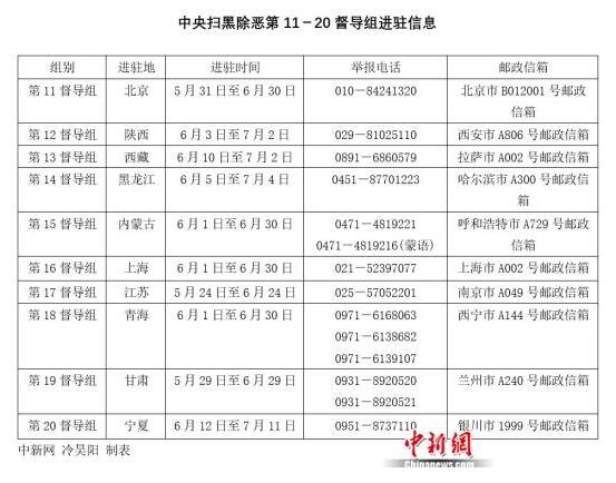 中央扫黑除恶第11-20督导组进驻信息。 中新网冷昊阳制表