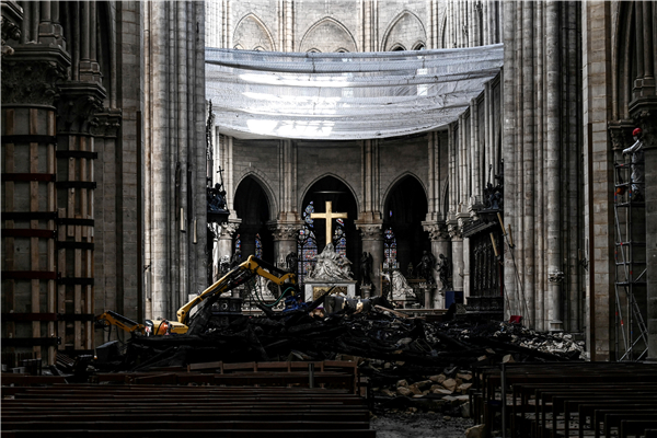 巴黎聖母院大教堂內祭壇上的瓦礫和十字架受到火災的嚴重損壞。資料圖片