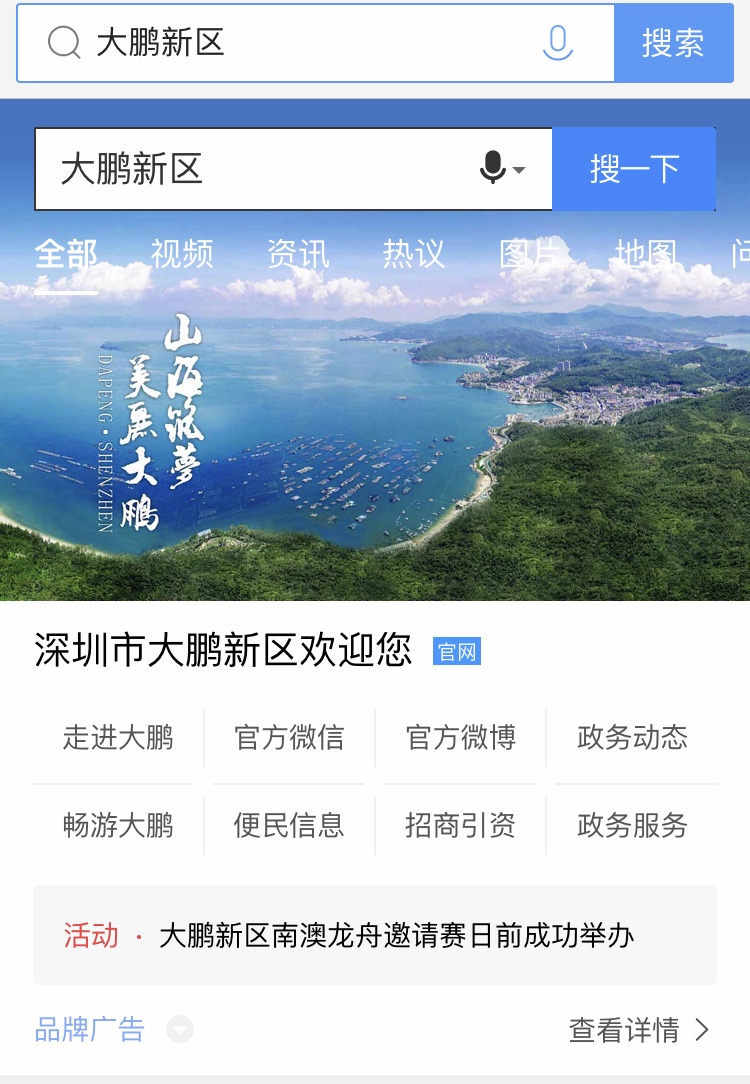 大鹏新区率先上线百度“城市名片”