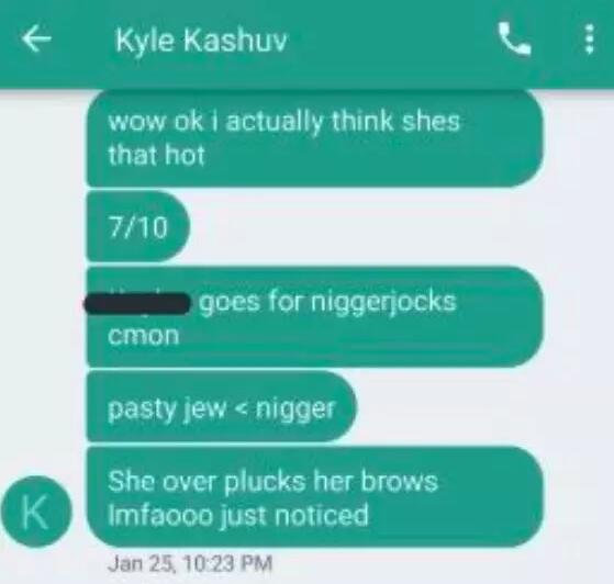 Kyle還在和另一個的私人聊天中,詆毀一位女性,稱對方為““goes for ni**erjocks” (對和非裔美國人交往的女性的一種極具侮辱性的形容)