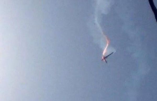 伊通社發布的無人機被擊落照片畫面模糊,僅能辨認出一架飛行器正燃燒、墜落。網絡圖片