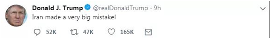 同樣在20日,特朗普在推特上發文說:“伊朗犯下了大錯!”↓