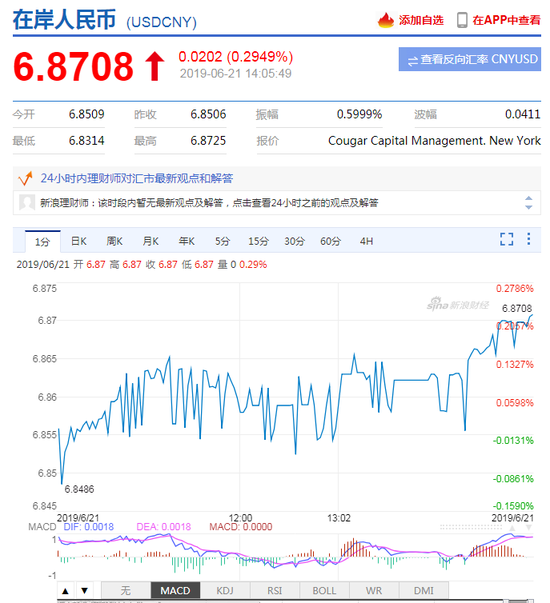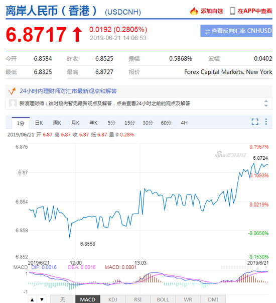 6月21日,在岸人民币(6.8723, 0.0217, 0.32%)贬值失守6.87关口,日内贬值逾200点。