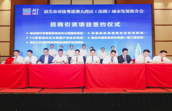 【香港商報網訊】記者李芳 通訊員沈明禮 蔡仁銀報道:6月20日下午,粵北生態名城韶關市對接粵港澳大灣區(深圳)城市發展推介會在深圳舉行,並現場簽約了5G智慧城、大數據產業、綠色工藝與材料研究院等17個高新技術及環保產業項目。韶關市委書記李紅軍、深圳市副市長王立新出席推介會並致辭,韶關市長殷煥明主持會議。