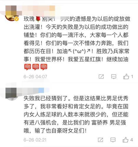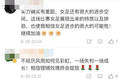 盡管遭到淘汰,但女足姑娘們本場比賽的表現還是贏得了大多數網友的認可。網友并沒有過多責怪,而是紛紛為鏗鏘玫瑰們獻上了掌聲和鼓勵。他們認為,這支女足雖然落敗,但拼勁和付出的汗水,足以令人感到欣慰。