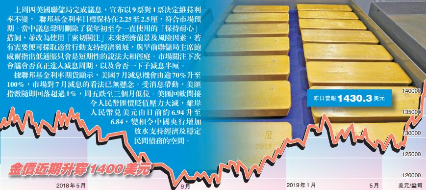 聯儲局減息預期以及偏軟的美元帶動金價上漲,升穿每盎司1400元,為六年首見。觀乎環球市場風險因素還多,央行又增持黃金抗衡美元氾濫,黃金進一步上試高位指日可待。