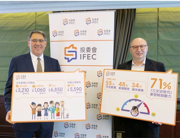 投委會於今年5月進行「三文治世代的理財行為和態度」調查,訪問了400位育有就讀小學子女的香港成年人士,受訪者平均年齡為40.2歲,平均家庭月入約5.3萬元,高於香港家庭入息中位數水平。71%受訪者表示感到財政壓力,尤其是80後的年輕父母(75%)較其他較年長的年齡組別感到更大壓力。