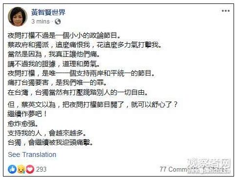 此外,島內“獨”派人士又發起所謂“反紅色媒體”游行,第二天,黃智賢主持的政論節目——《夜問打權》被停播。