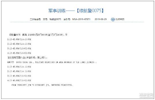 此前,中华人民共和国海事局官网发布的最新航行警告“琼航警0075”,6月29日00:00时至7月3日24:00时在南海附近海域1:13-48.00N/114-10.00E;2:12-48.00N/114-10.00E;3:12-48.00N/116-02.00E;4:13-48.00N/116-02.00E诸点连线范围内进行军事训练,禁止驶入。