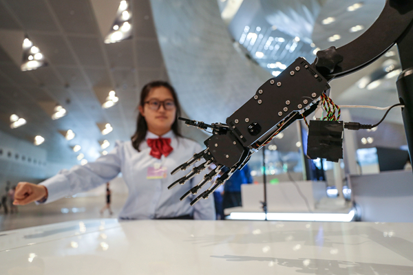 會場上,工作人員演示使用5G 傳輸信號控制的「猜拳」機器人。新華社