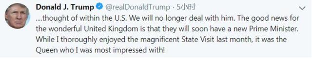 “我一直对英国首相特雷莎·梅处理英国脱欧的方式持批评态度。她和她的代表们把局面搞得一团糟。我已经告诉了她应该怎么做,但她决定走另一条路。”特朗普首先写道。