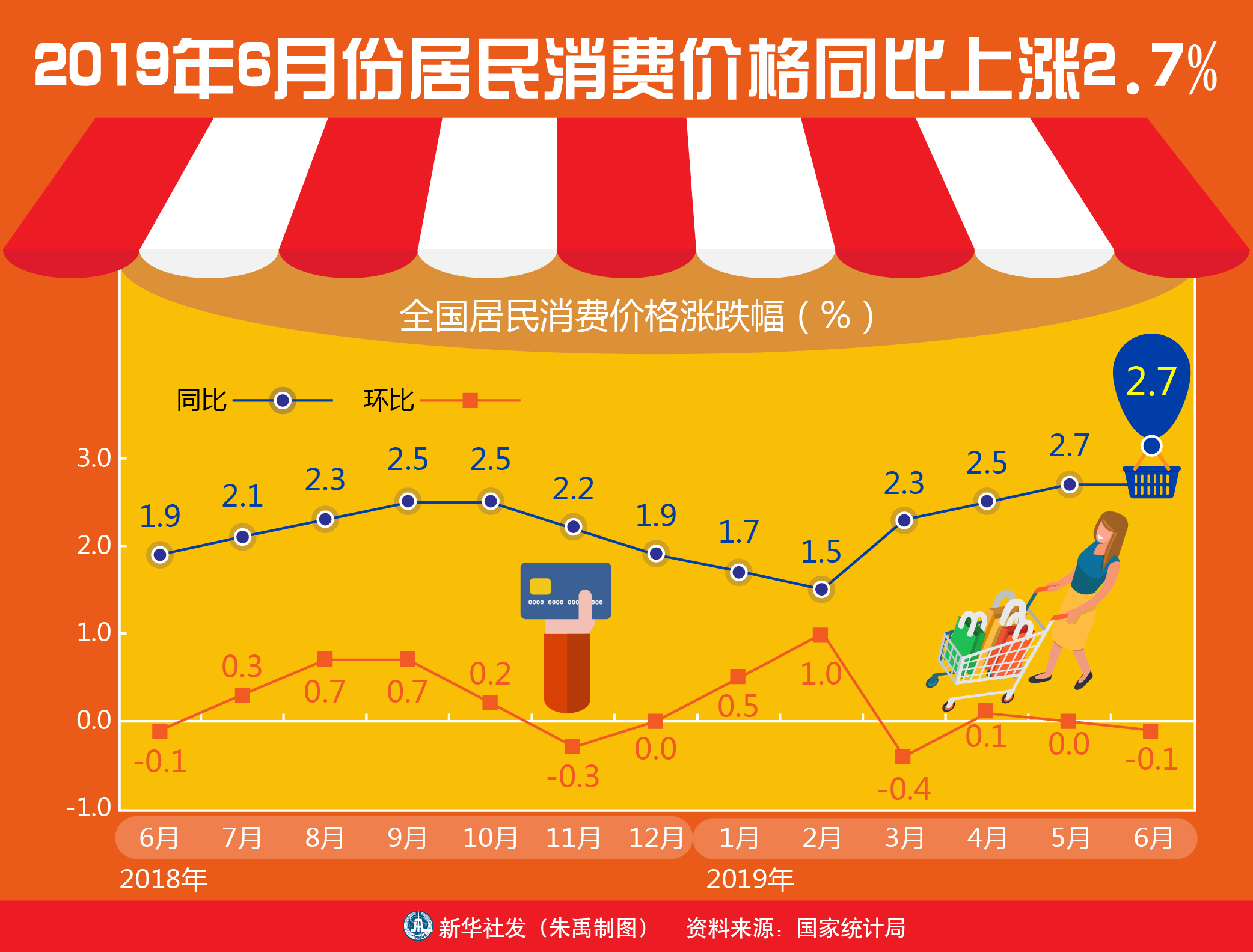 【香港商報网訊】記者伍敬斌報道:昨日,國家統計局發布了2019年6月居民消費價格(CPI)數據。數據顯示,6月CPI同比上漲2.7%,漲幅與上月相同,環比則下降0.1%。分析指,6月CPI仍然主要受食品價格推動,核心CPI依舊處於低位。由於經濟短期承壓,終端需求疲弱致使CPI難向上突破。從趨勢看,年內CPI高點已過,預計三季度通脹中樞將較二季度下降,核心CPI將維持低位,或要等到四季度才能看到轉向。