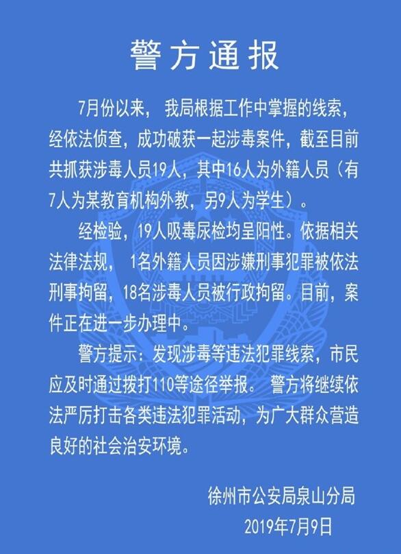 中国江苏省徐州市警方7月10日通报称,7月以来,经依法侦查,成功破获一起涉毒案件,截至目前共抓获涉毒人员19人,其中16人为外籍人员(7人为某教育机构外教,另9人为学生)。依据相关法律法规,1名外籍人员因涉嫌刑事犯罪被依法刑事拘留,18名涉毒人员被行政拘留。
