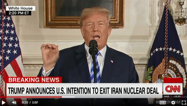 2018年5月8日,特朗普在白宫宣布退出伊核协议。(截图自美国有线电视新闻网视频)