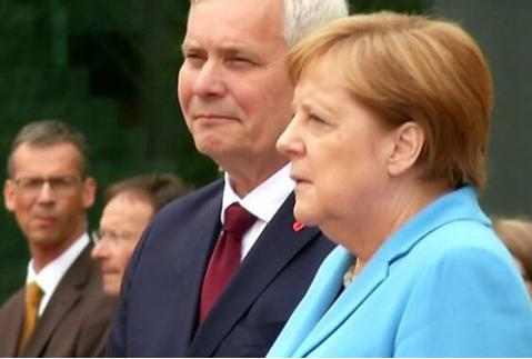 默克尔7月10日会见芬兰总理林内时再次出现明显抖动(图源:BBC)