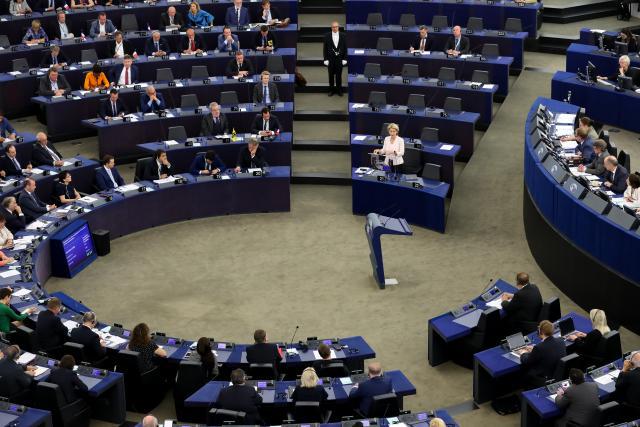 7月16日,在法国斯特拉斯堡欧洲议会总部,下一届欧盟委员会主席候选人冯德莱恩(中)在投票前陈述发言。新华社