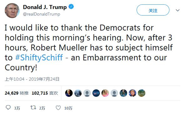 在众议院司法和情报委员会的听证会上,面对特朗普保守派共和党盟友的接连猛攻,穆勒为调查的诚信度进行辩护。特朗普则赞许这些议员是“不可思议的战士”。