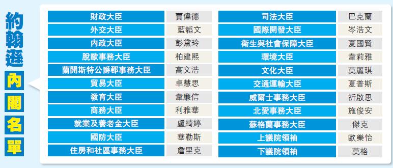 此外,約翰遜把親友等不少堅定支持者留在身邊。他的長期盟友華勒斯「擠掉」在黨內口碑不俗的莫佩琳,出任國防大臣;弟弟喬獲任分管商業事務的國務大臣;兩個多月前因洩密遭解職的前國防大臣韋廉信得以回歸,出任教育大臣。