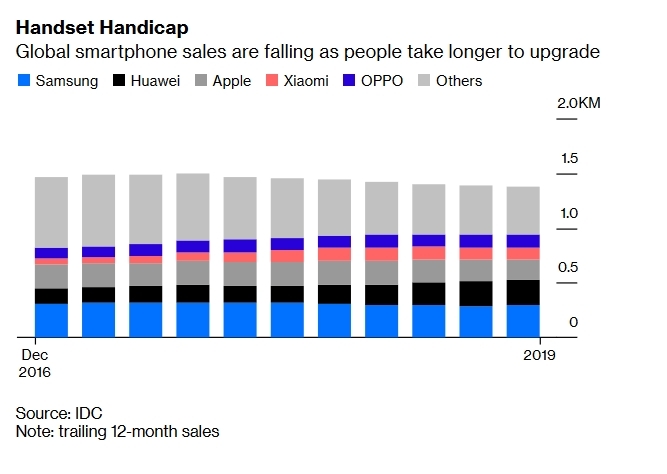 隨著人們升級更換手機的周期延長,全球智能手機銷量正在下降