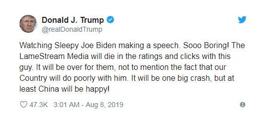 报道称,特朗普也关注着拜登的这场演讲,并且在推特上第一时间发表了“观后感”。他说:“看着昏昏欲睡的乔·拜登做演讲。太无聊了!”