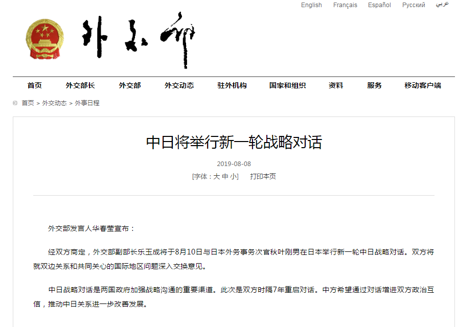 經雙方商定,外交部副部長樂玉成將於8月10日與日本外務事務次官秋葉剛男在日本舉行新一輪中日戰略對話。雙方將就雙邊關系和共同關心的國際地區問題深入交換意見。