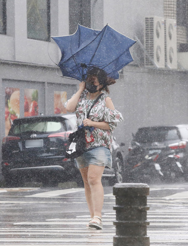 冒着風雨前行的路人。
