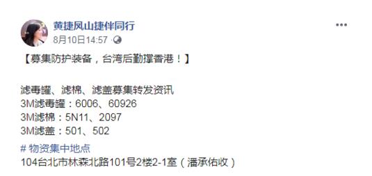 海外网8月12日电 香港激进示威者被指背后有“台独”势力支撑,如今再次曝出证据。8月10日,“时代力量”成员黄捷在社交网站叫嚣,为香港暴徒筹集物资,包括常见的3M滤罐、滤棉及滤盖,她更宣称“港人冲前线,台湾做后勤”。