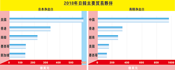 先看日韓貿易關係。淨出口是國內生產總值其中一部分,查兩地主要貿易夥伴,日本最大淨出口地順序為美國、香港及韓國;而韓國最大淨出口地為中國、香港及越南。