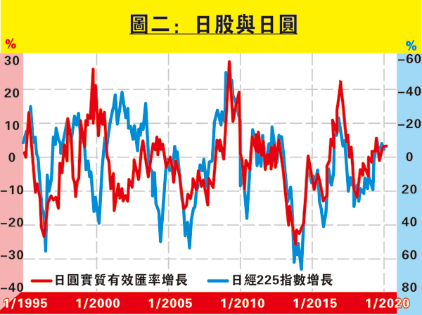 市場普遍認為日韓關係緊張歸咎歷史遺留下來的問題,但在這亂局下,日圓似乎是最大得益者。先看本地因素,自2002年以來,日本的低利率政策使日圓成為主要套息交易的對象,跌市時投資者賣出風險資產而轉回日圓;因此圖二顯示日經指數增長與日圓存明顯反比關係,而關係在2002年後確實比較明顯,不過兩者沒有時差。