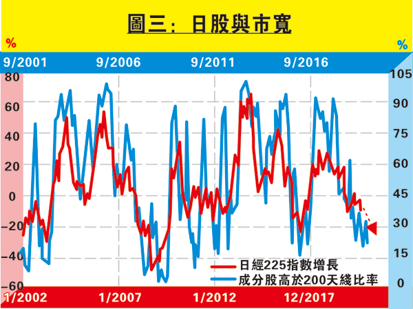 若參考市寬,以成分股高於200天線比率來看,圖三顯示其走勢領先日經225指數增長4個月,按紅箭預示,日股增長在未來4個月有明顯下行壓力,與圖一得出經濟增長將放緩合。再套上圖二得出的關係,可推測日圓實質有效匯率按年增長至少在11月前繼續上升。由是觀之,日韓貿易摩擦加上日本經濟面弱,均利好日圓前景;估計美元兌日圓將下試2016年11月低位101.2。