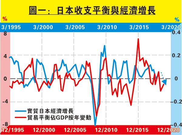 那麼日本經濟能置身事外麼?未必。國際收支按年變動是推動經濟增長的主要因素之一,因此圖一可見日本實質國際收支平衡佔GDP的按年變動與實質經濟按年增長整體同向,前者領先後者約三季,由此推測日本經濟增長至少在未來三季仍見回落,更處於萎縮。由此可見,日本基本面已經偏軟,目前加上日韓貿易摩擦其實損人不利己。