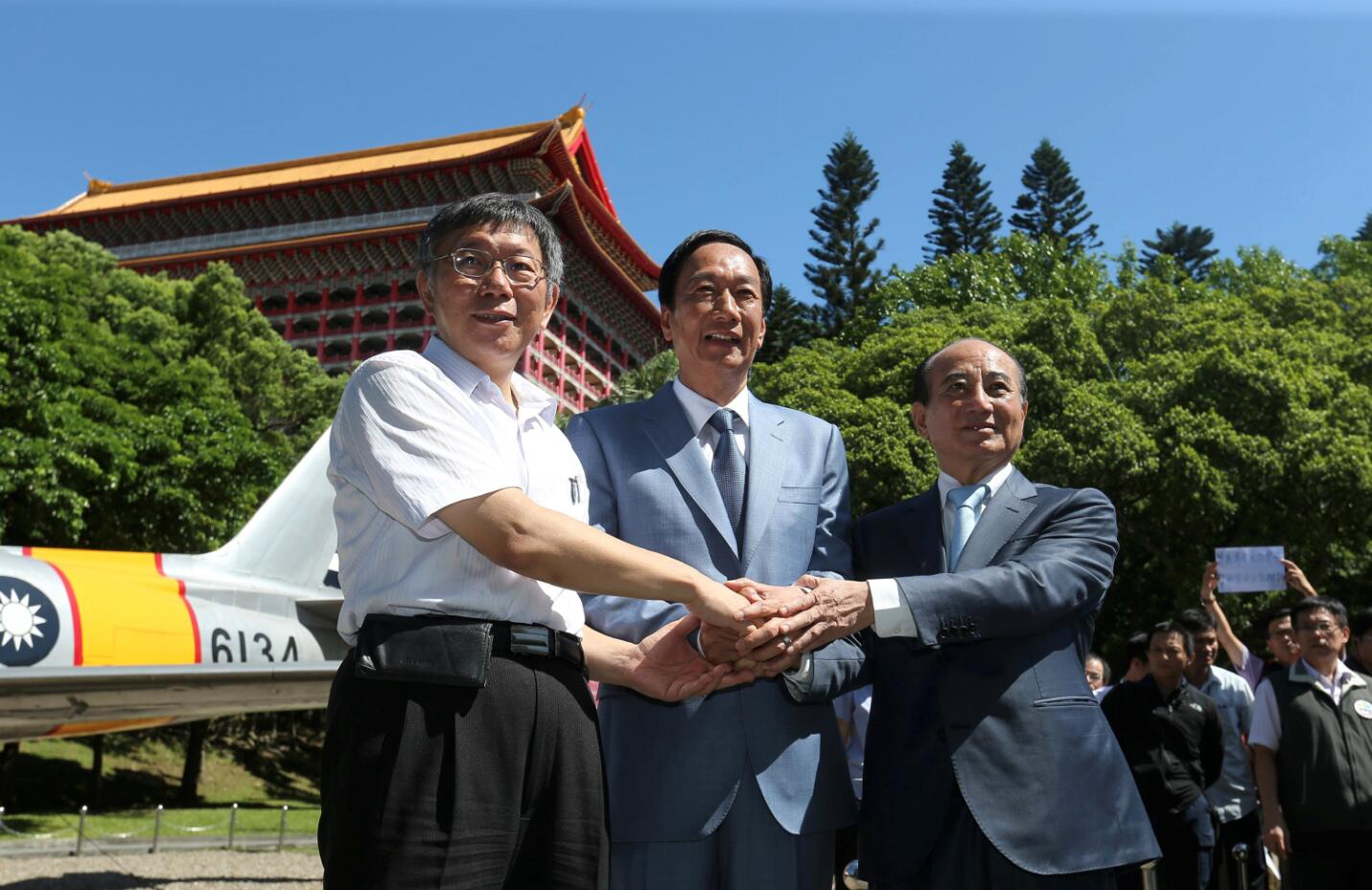 ▲三人握手合影,顯示郭柯王關係未破局。 中央社