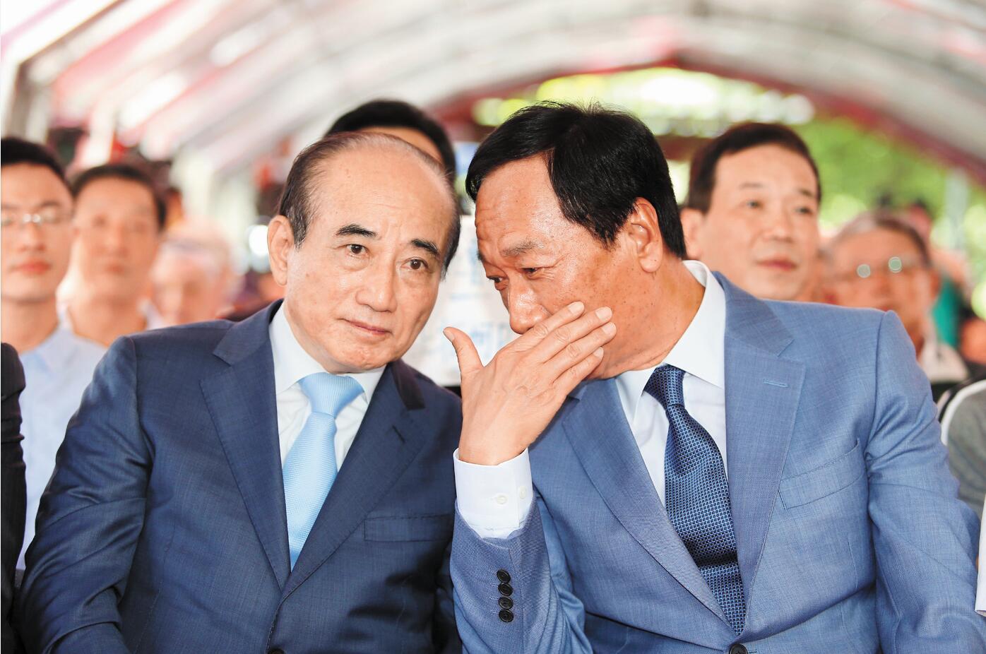 郭台銘(右)與王金平 「咬耳朵」 。 中央社