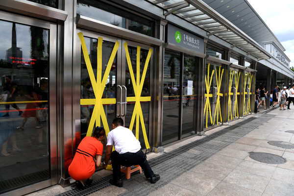 廈門輪渡碼頭工作人員正在關閉碼頭通道。中新社