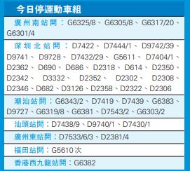 25日停運或改終到始發站的普速列車有:廣州東站開T8379/82、T8365/8次,大埔站開T8381/0次,梅州站開T8367/6、T8369次,深圳站開T8370次,汕頭站開K800/797/800次停運;汕頭站開K9012/3/2次改當日在東莞東始發,汕頭站開K688/5/8次改當日在廣州站始發。