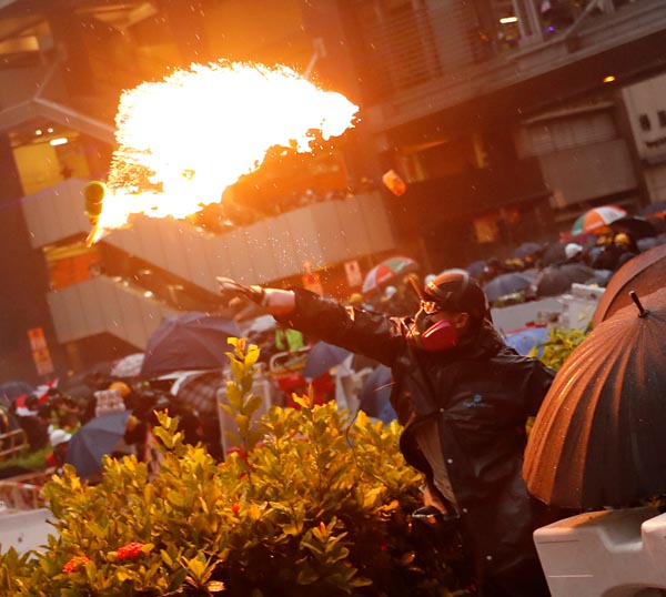 周末暴力示威場面顯示,一批暴徒直接動用汽油彈、磚頭、鐵枝等故意製造衝突,追趕攻擊警察,造成多名警員受傷,有警員面對生命安全受威脅,甚至不得不鳴槍警示。這批激進示威者意圖顯然並不在和平表達訴求,而是為了故意激發與警察武力衝突,除了攻擊警方,現時他們更是將暴力擴散至全港各地區,港島、九龍、新界幾乎所有地區都已被他們「搞」過一次,機場也成為非法暴力圍堵對象,港鐵成為暴力破壞對象,甚至商廈商舖乃至普羅市民都成為他們攻擊對象。