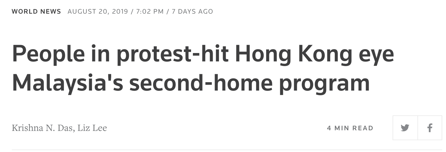 路透社先於8月20日援引消息人士報道,今年申請馬來西亞“第二家園(MM2H)”長期居留計劃的香港地區人士,已有251人,去年全年僅193人。該媒體援引非官方數據機構MyExpat報告,稱尤其是在過去2周內,香港地區申請該計劃人數陡增,但未透露具體數字。