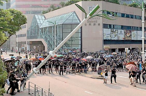 香港反行其道,極端示威者鋸斷智慧燈柱。 資料圖片