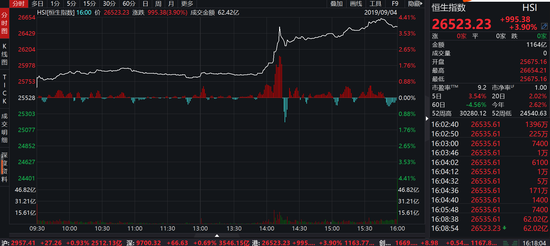 9月4日消息,尽管隔夜美国股市大跌,但港股完全不受影响,今日恒指高开高走,午后出现不足半小时暴涨至4%的情况,临近尾盘,恒指涨幅进一步扩大,最大涨幅为4.41%,高见26654.21点,涨逾千点,最多涨1126点。截至收盘,港股恒指暴涨3.9%,报26523点,日内涨近千点,创去年11月2日以来最大单日涨幅。大市成交1164亿港元。消息指,香港行政長官林鄭月娥將於今日(4日)下午4時在禮賓府會見港區全國人大代表、全國政協委員和全體建制派立法會議員。據香港多家媒體報道,林鄭月娥在會見結束後或將召開記者會,預料將涉及香港近期的反修例政治風波。而这或将为香港持续数月的动荡带来转机。
