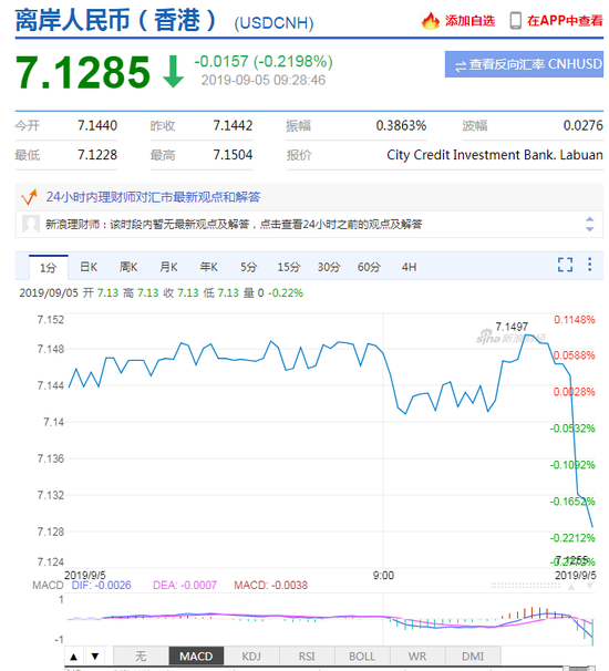 9月5日,离岸人民币(7.1329, -0.0131, -0.18%)短线快速拉升收复7.13关口,日内升值逾150点。