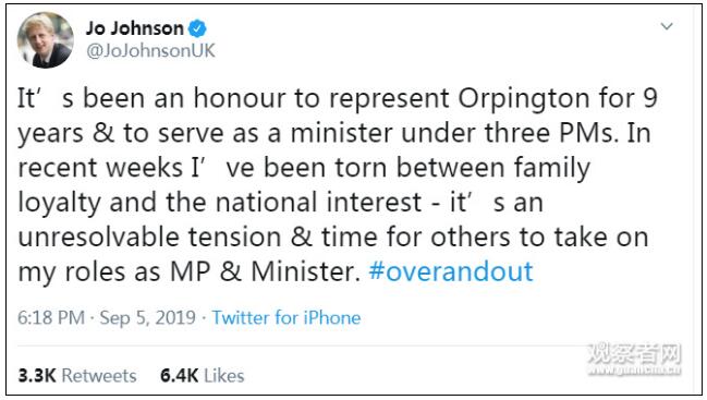 继议会首战失利、下院立法反“硬脱欧”、提前大选议程被否后,天空新闻台9月5日透露,约翰逊的亲弟弟、英国商业、能源与产业战略部国务大臣乔·约翰逊,也于当天晚间6点宣布辞职。