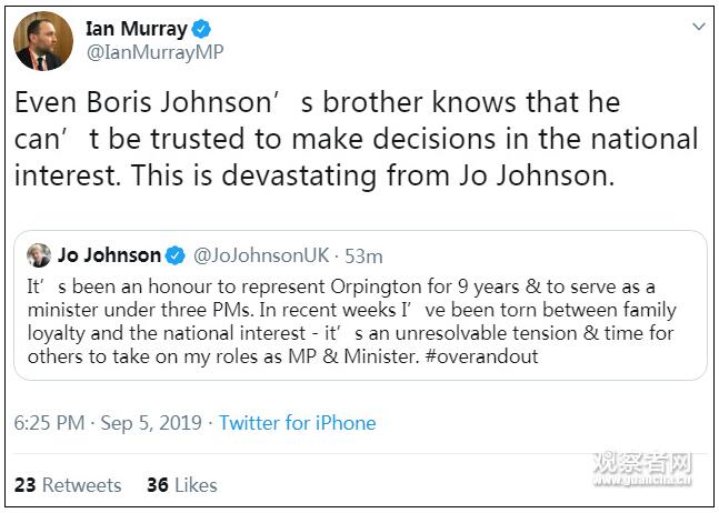 如今这出“兄弟反目”,又被在野党用来攻击英国首相。工党议员穆雷(Ian Murray)在社交媒体上写道,“即便是鲍里斯·约翰逊的弟弟也知道,鲍里斯·约翰逊就国家利益问题上做出的抉择,不可信。”