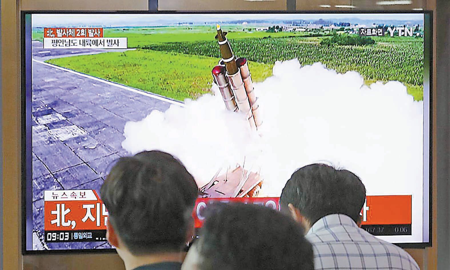 在首爾,民眾觀看有關朝鮮試射兩枚短程發射體的電視報道。網絡圖片