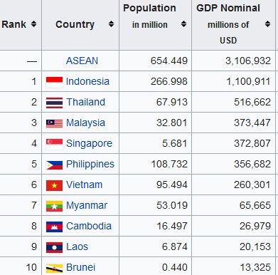 東南亞各國今年的人口及GDP 從上到下分別是印尼、泰國、馬來西亞、新加坡、菲律賓、越南 數據來源:IMF