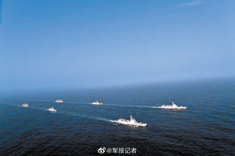 中國海軍護航編隊在亞丁灣東部海域為本港「綠寶石」號商船伴隨護航。圖片來自微博@軍報記者